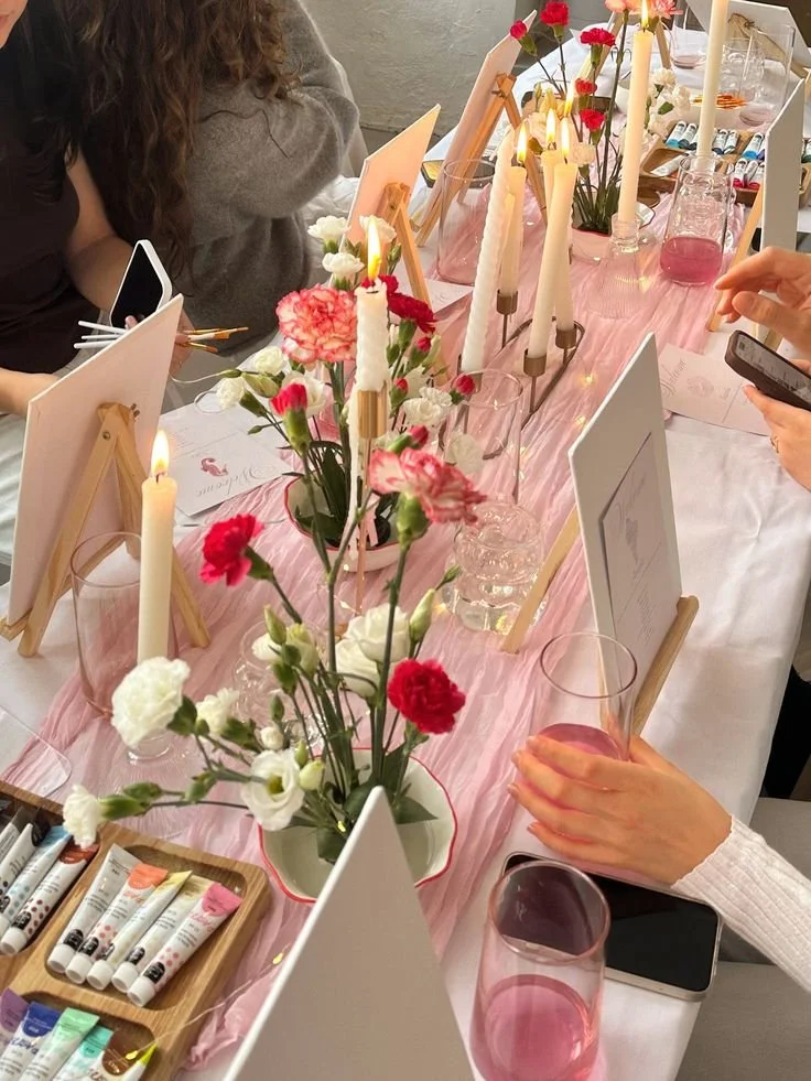 Giggles, glasses of rosé, bubbly, or pink lemonade, pretty tables, and a blank canvas waiting for your magic touch. No experience needed!